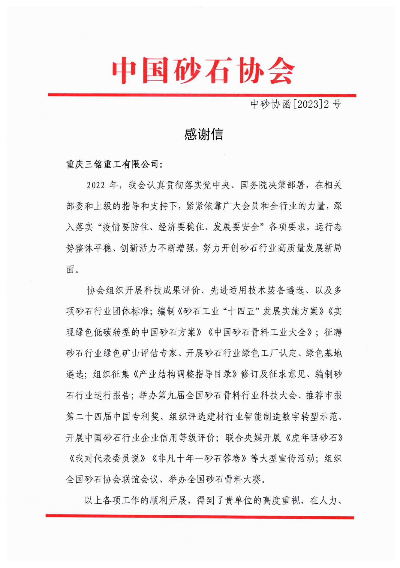 感謝信│攜手同進(jìn),團(tuán)結(jié)互助,合力推動(dòng)砂石行業(yè)高質(zhì)量發(fā)展
