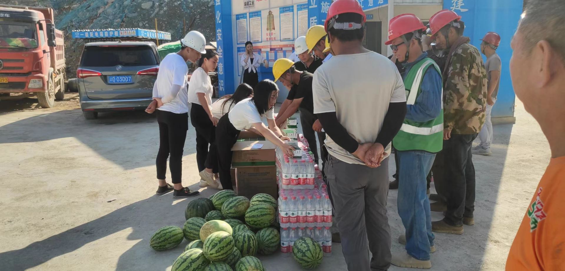 項(xiàng)目建設(shè)工地就像一個(gè)”大火爐”,熱氣彌漫。早上室外溫度就高達(dá)30多度,在午間烈日炙烤下,室外溫度近60度。如何戰(zhàn)高溫、搶工期、保障工程項(xiàng)目有序進(jìn)行?三銘重工董事長龍福建明確指示項(xiàng)目部要合理安排和調(diào)整上崗時(shí)間,高度重視降溫消暑和疫情防疫工作。同時(shí),他要求備好涼茶、礦泉水、藿香正氣液、花露水等防暑降溫用品,通過開展送清涼、送健康、送慰問等形式為奮戰(zhàn)在一線的員工們做好后勤服務(wù)工作。